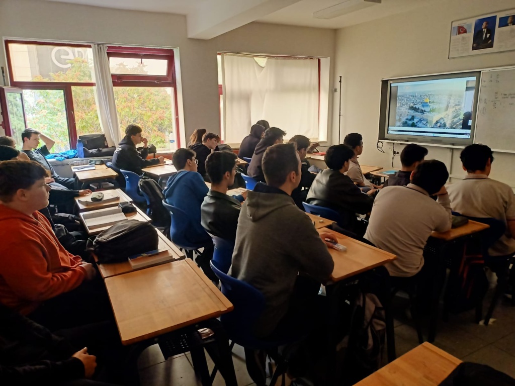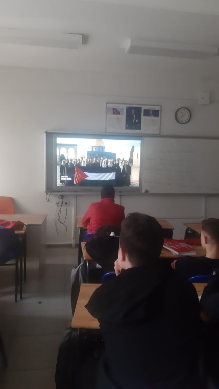 Türkiye Yüzyılı Maarif Modeli'nin “Erdem-Değer-Eylem” yaklaşımını esas alarak öğrencilerimizde insan hakları bilinci, mazlumlara duyarlılık, hak, adalet, merhamet ve barış değerleri doğrultusunda farkındalık oluşturmak ve Filistin-Kudüs- Gazze konusunda öğrencilerimizi bilgilendirmek amacıyla sınıflarımızda "İzler Filistin" belgeselini izledik.